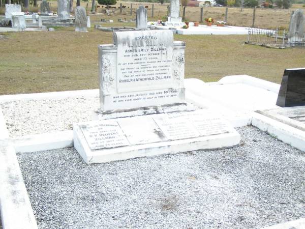 Agnes Emily ZILLMAN,  | died 24 Oct 1935 aged 73 years,  | erected by husband & children;  | Rudolph Atherfold ZILLMAN, husband,  | died 24 Jan 1952 aged 80 years;  | R.V. Redvers ZILLMAN, son,  | died 2 Sept 1975 aged 74 years;  | Edith Lorna ZILLMAN, wife of J.R.F. ZILLMAN,  | born 5-10-1903 died 25-11-1995;  | J. Rolly ZILLMAIN,  | died 5-12-84 aged 86 years,  | husband of Lorna,  | father of Allan, Graham, Kenneth & families;  | Upper Caboolture Uniting (Methodist) cemetery, Caboolture Shire  |