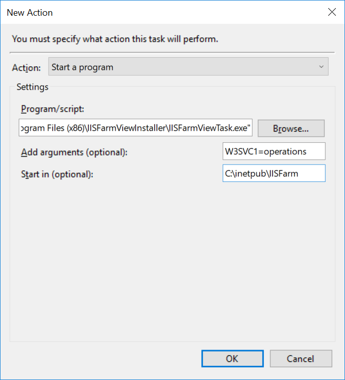 Select the "Actions" tab. For "Action" select "Start a program" In the Program/script field, Browse to the folder you chose for the installation and select IISFarmViewTask.exe.In the Add arguments you can add space separated configuration items:
