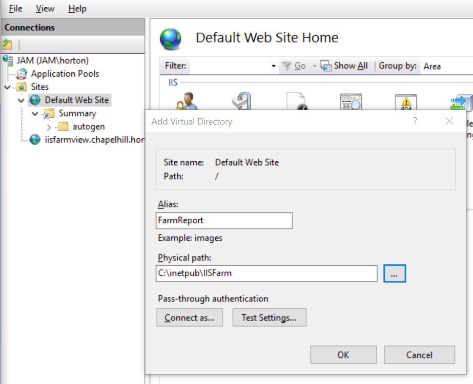 Information Services (IIS).Select the Site Right click and select " Add virtual directory"Add an alias for IIS Farm View reports. Enter the "Start in" directory that was used in configuring the Action. |