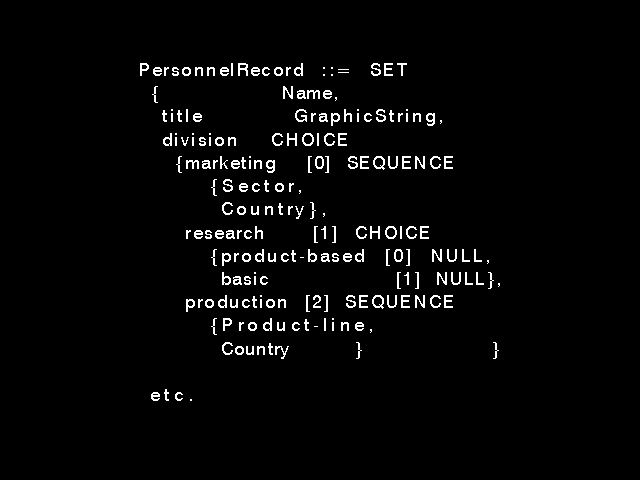 In early 1980 there was recognition within the CCITT group that defining the X.400 (electronic mail) protocol would involve some very complicated data structures, and that notational support for this activity was essential. A language was needed with about the power of normal high level programming languages for defining repetitive and optional structures using a number of primitive data types. But it needed to be supported by an algorithm (later called encoding rules) which would determine the bit-pattern representation during transfer for any data structure (no matter how large or complex) that could be written down using the language. The Xerox Courier Specification provided important input, and the notation was developed into CCITT Recommendation X.409 - part of the X.400(1984) series.