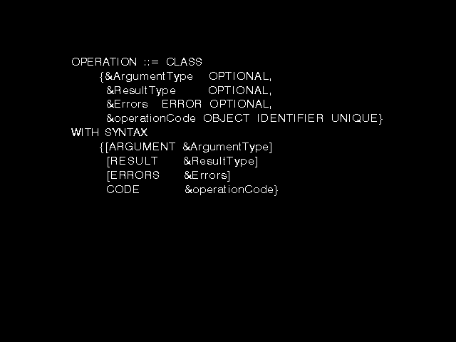 which, surprise, surprise, (with an appropriate definition of the new type syntax and the new value syntax in the OPERATION macro) is just the syntax proposed for addition to ASN.1 in order to support the ROSE requirement for a notation to define operations!