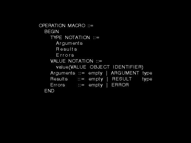 When defining a macro, the definer gave it a name (OPERATION for example!) and specified the new syntax for type definition and the new syntax for value definition. Thereafter, the keyword OPERATION, followed by the new type syntax, could be used anywhere a normal ASN.1 type definition could be written, and the corresponding new value syntax could be written anywhere a value of that type could appear (for example after DEFAULT). Unfortunately, the nature of the macro definition mechanism made the actual type being defined by the new type notation dependent on the parsing of a value using the new value notation. As type notation can and does frequently appear in ASN.1 with no corresponding value notation, this was clearly something of a flaw!