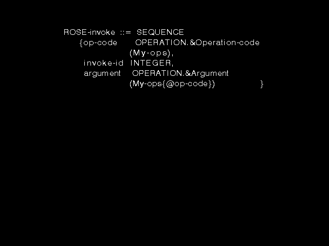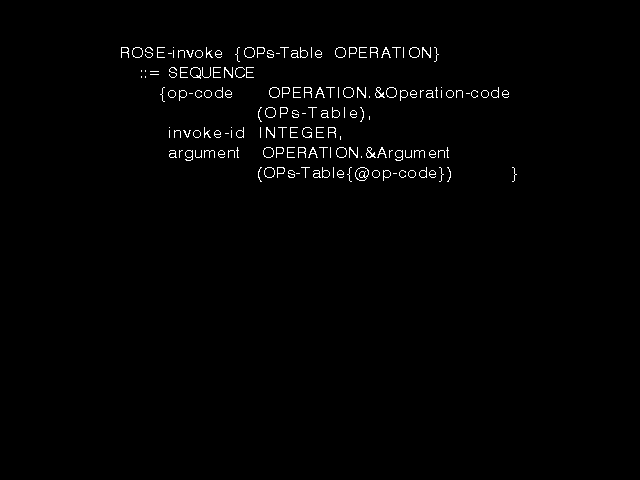 The ROSE group did not define any actual operations. That was for the users of ROSE (the main-stream X.400 workers) to do, but they did want a simple and defined notation specifying that would let such other workers define operations to be invoked using ROSE. The syntax of figure 8.7 was designed to provide precisely that.