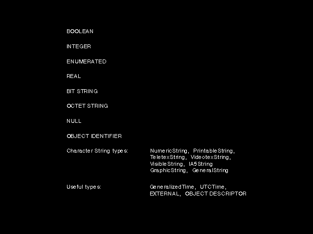 A complete list of the ASN.1 primitive types in the version of ISO 8824 dated 1990 is given in figure 8.3: ASN.1 primitive types (1990).