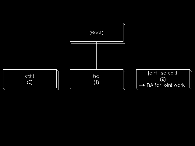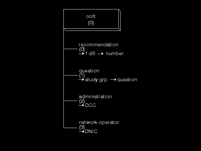 Note the problems that this use of "ccitt" causes when the name of CCITT was changed to ITU-T. (At the time of writing, the top arc is still labelled "joint-iso-ccitt", but the text says that the responsibility for further allocation lies with ITU-T.)