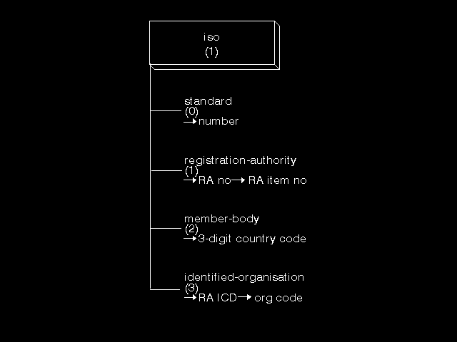 What then does the OBJECT IDENTIFIER name space look like? It is based on an object identifier tree which is a structure with a root node, arcs beneath that to other nodes, with arcs beneath them, and so on. Each node is assigned to some responsible body that allocates arcs and nodes beneath it. The body ensures that all the arcs beneath its node are numbered sequentially starting from zero (names - lower case - can also optionally be assigned to an arc), and that each node beneath it is either assigned to some responsible body (or retained for further use by the body itself) or is assigned to name some information object. "Information object" is the term used for things that are named by object identifiers, and reflects the fact that usually (but not always) the "thing" being named is some definition or piece of information, such as an abstract syntax definition. Thus information objects being named by object identifiers are all associated with some leaf node of the tree. The object identifier name of an information object is a list of integer values which are the values of the arcs, taken in order, from the root of the tree to the leaf node assigned to name the information object. Thus a typical object identifier could be written as