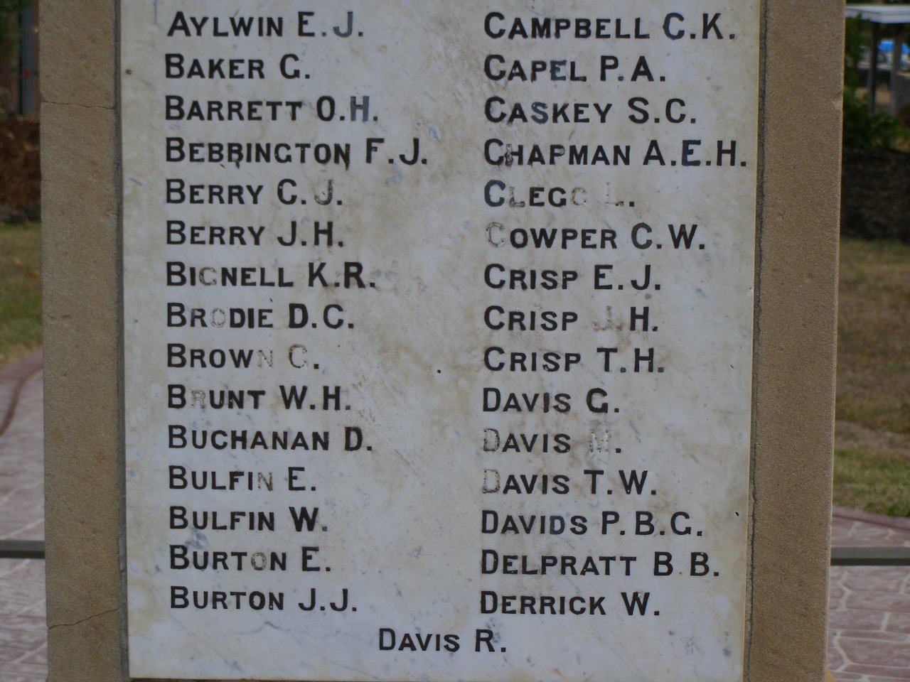 E.J. AYLWIN G. BAKER O.H. BARRETT F.J. BEBBINGTON C.J. BERRY J.H. BERRY K.R. BIGNELL D.C. BRODIE C. BROWN W.H. BRUNT D. BUCHANAN E. BULFIN W. BULFIN E. BURTON J.J. BURTON C.K. CAMPBELL P.A. CAPEL S.C. CASKEY A.E.H. CHAPMAN L. CLEGG C.W. COWPER E.J. CRISP J.H. CRISP T.H. CRISP G. DAVIS M. DAVIS T.W. DAVIS P.B.G. DAVIDS B.B. DELPRATT W. DERRICK R. DAVIS Greenmount War Memorial