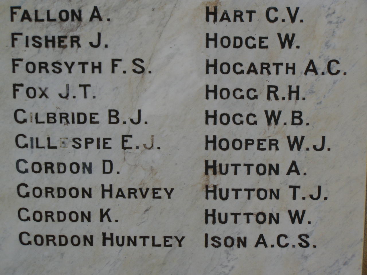 A. FALLON J. FISHER F.S. FORSYTH J.T. FOX B.J. GILBRIDE E.J. GILLESPIE D. GORDON HARVEY GORDON K. GORDON HUNTLEY GORDON C.V. HART W. HODGE A.C. HOGARTH R.H. HOGG W.B. HOGG W.J. HOOPER A. HUTTON T.J. HUTTON W. HUTTON A.C.S. ISON Greenmount War Memorial